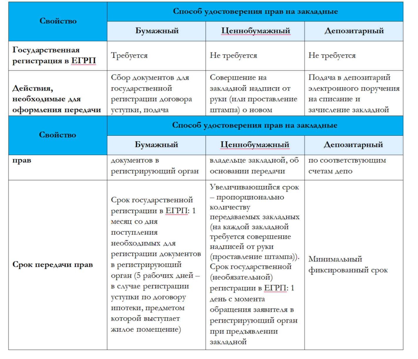 § при переходе прав на закладную не требуется регистрация нового залогодержателя в Едином государственном реестре прав на недвижимое имущество и сделок с ним (ЕГРП), тогда как при бумажном способе уступка прав по ипотечному кредиту признается действительной только после государственной регистрации в ЕГРП;